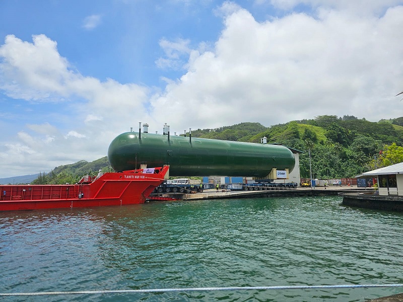 Dans le cadre de son projet de terminal gazier Mana Ito d'une capacité de 3 000 tonnes de stockage, l'homme d'affaires Albert Moux (également propriétaire de Tahiti Infos, NDLR) a assisté vendredi au déchargement de la première des trois cuves de 8 mètres de diamètre et 37 mètres de long à Hitia'a. Les deux autres cuves devraient être déchargées samedi et dimanche. À cette occasion, Albert Moux, qui a investi “quatre à cinq milliards” de francs dans ce projet, a salué un “aboutissement” après avoir passé plusieurs années à chercher un “terrain idéal” pour installer son terminal gazier. Rappelant notamment que la route de 350 mètres avait été aménagée, goudronnée et terrassée, l'homme d'affaires a salué le “travail remarquable” de l'ingénieur qui a géré le projet, Sébastien Millot : “Tout a été très bien fait et étudié au millimètre près, ce n'est pas évident de débarquer des cuves de 450 tonnes, c'est une prouesse technique”. “Ce projet n'est plus un rêve mais une réalité”, a conclu l'homme d'affaires.