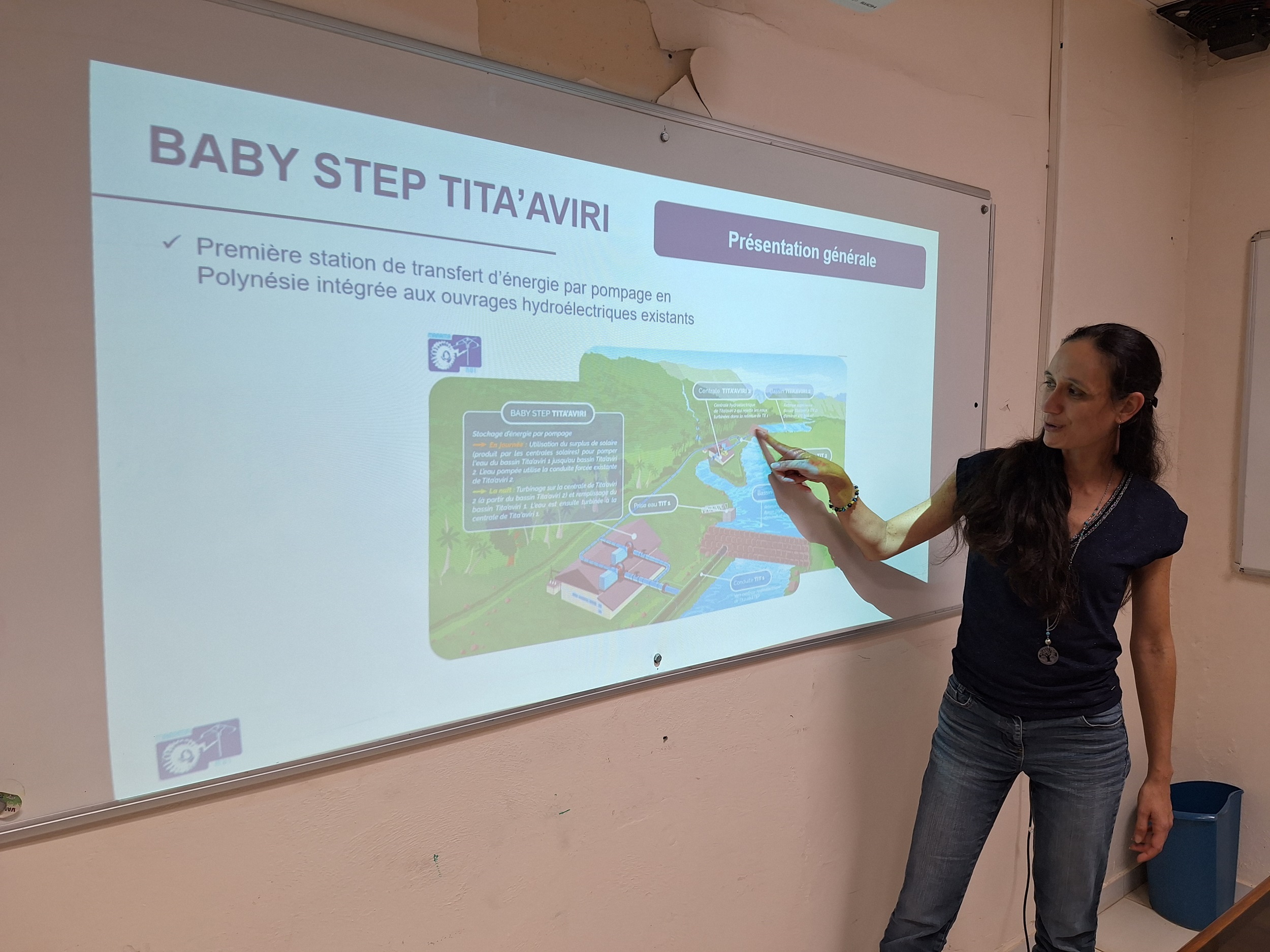 Baptisé “Baby STEP”, ce premier projet endossera le rôle de démonstrateur dans la vallée de Titaaviri, à Papeari, dont les barrages et centrales répartis sur deux niveaux totalisent 11 % de la production de Marama Nui. “On souhaite intégrer la Baby STEP à ces aménagements. En journée, grâce au surplus d’énergie solaire, l’eau est en mode pompage de Titaaviri 1, en bas, vers Titaaviri 2, en haut, pour créer du stockage. La nuit, on n’a plus de surplus solaire, donc on repasse en mode turbinage”, explique Rebecca Wong Fat-Derval, responsable projets hydroélectriques.