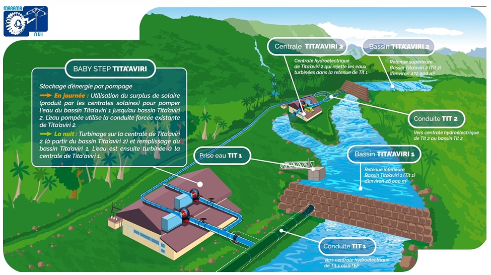 Tahiti, le 15 janvier 2025 – Transformer le surplus d’énergie solaire en hydroélectricité pour limiter le gaspillage et le recours aux batteries, c’est le projet porté par Marama Nui avec “Baby STEP”, une station de transfert d’énergie par pompage qui viendra s’ajouter aux installations existantes dans la vallée de Titaaviri, en 2026. Si ce démonstrateur est concluant, deux plus grands projets pourraient suivre : “Mama STEP” et “Big Mama STEP”.