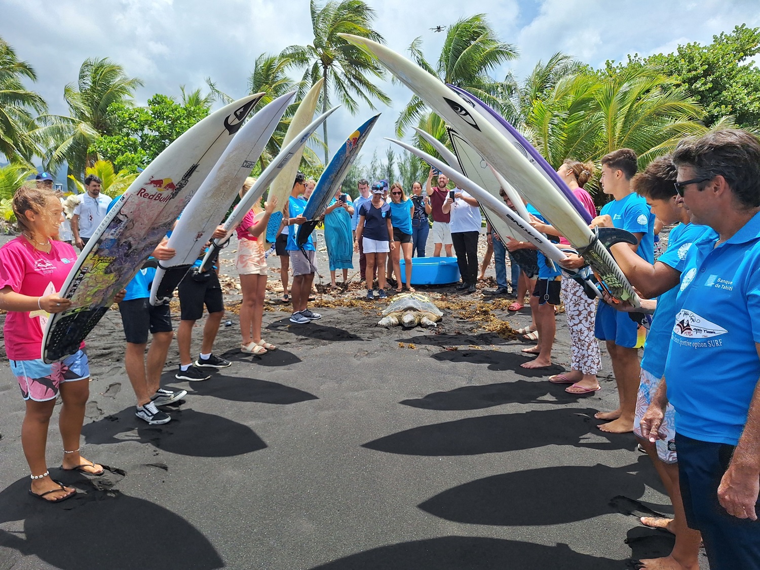 Scène émouvante sur la plage de Taharu’u, à Papara, vendredi midi. Les élèves de la section surf du lycée Tuianu Le Gayic ont fait une haie d’honneur avec leurs planches pour guider vers l’océan Tohonu, une tortue verte miraculée. Si une couronne de tiare Tahiti a été posée sur sa carapace en guise d’adieu, un suivi sera assuré à distance grâce à une balise satellite autonome fixée sur son dos.