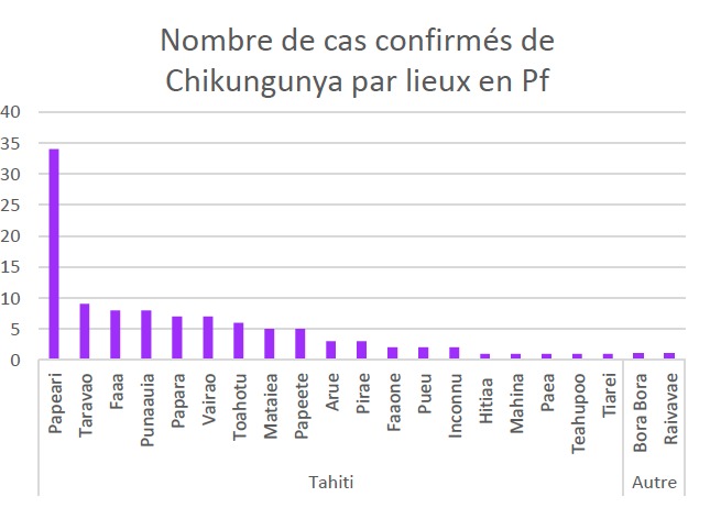 Toutes les communes de Tahiti comptent un ou plusieurs cas de chikungunya déclaré, mais c’est à Papeari, d’où est partie l’alerte épidémique que l’on recense actuellement le plus de malades avec 35 cas confirmés désormais. Dans les autres archipels, le Bulletin de veille sanitaire publié ce vendredi soir indique un cas confirmé à Bora Bora, un cas confirmé à Raivavae aux Australes. La situation est très particulière enfin sur l’atoll d’Apataki dans les Tuamotu où 64 cas suspects ont été dénombrés. Les analyses de confirmation des cas sont en cours. Les prélèvements sanguins ayant dû être expédiés vers Tahiti pour les analyses en laboratoire. Un cas suspect de chikungunya est défini par un patient présentant une forte fièvre (> 38,5°C) ET des douleurs articulaires invalidantes, sans point d'appel infectieux. Une éruption cutanée peut être également associée. Il faut une analyse biologique pour confirmer un cas.
