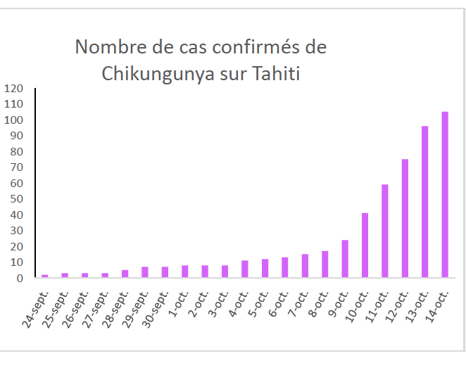 PAPEETE, le 17 octobre 2014. Depuis la confirmation le vendredi 10 octobre des 15 premiers cas de chikungunya en Polynésie française, la progression sur ce front épidémique a été extrêmement rapide. On compte, une semaine plus tard, ce vendredi 17 octobre, 107 cas confirmés sur les 184 prélèvements testés à l’Institut Louis Malardé. Le nombre de cas suspect est estimé à plus de 400 et 114 prélèvements sont toujours en cours d’analyse. Après une semaine de travail sur cette nouvelle épidémie et les résultats des analyses des cas suspects, il est établi que le taux de positivité est d’environ 58%. On peut donc raisonnablement penser que le nombre de cas confirmés sept jours après l’apparition des premiers cas se situe plus vraisemblablement à plus de 150 cas qu’à 107. Dix fois plus de cas confirmés en une semaine à peine !