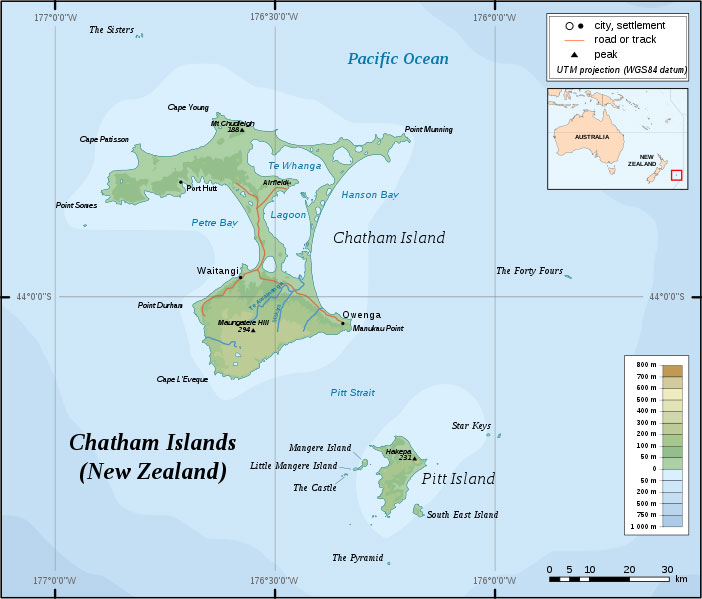 Le petit archipel des îles Chatham se trouve environ à 800 km à l’est de la ville de Christchurch en Nouvelle-Zélande, par quasiment 44° de latitude sud.