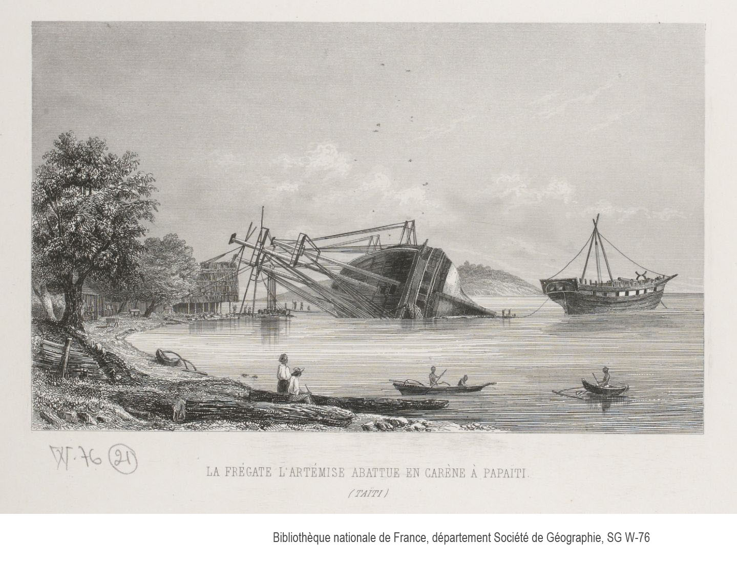 Malheureusement pour lui, en arrivant sur la côte est de Tahiti le 22 avril, L’Artémise éperonne le même récif que celui qui avait déjà piégé Boenechea en 1772. La voie d’eau est très importante, L’Artémise est à deux doigts de couler, mais finalement, elle parvient à Fare Ute où la frégate devra être couchée sur le côté pour être réparée.