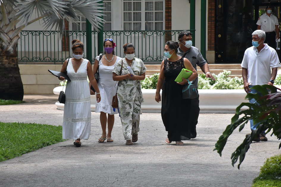 A 9 heures, une délégation de quatre membres du collectif Te ora o te fenua et de l’association A tamau i te hono a été reçue par un cadre en charge de la sécurité au haut-commissariat. "Nos doléances ont été entendues", témoignait Vairea Toomaru à l’issue. Une heure plus tard, le portail de la présidence s’ouvrait aux émissaires pour un entretien avec les autorités du Pays. Ils ont en réalité été reçus un peu plus d’une heure par des responsables de la plateforme Covid. "Oui, ils nous ont entendus. Mais leur message n’a pas changé : Vaccinez-vous !" a témoigné avec déception Vairea Toomaru au moment de rendre compte à la foule.