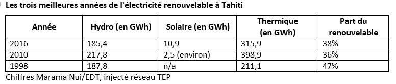 Car les énergies renouvelables à Tahiti, ce n'est qu'une poignée d'éoliennes, un tout petit peu de solaire, et beaucoup d'hydro-électricité. Grâce à la forte pluviométrie de 2016 et à des travaux d'augmentation des capacités des installations existantes, Marama Nui a injecté 185,4 gigawatt-heures sur le réseau électrique de l'île de Tahiti. Si ce n'est pas le record absolu, cette performance n'est pas loin de celle de 1998. Par contre elle n'arrive qu'à l'épaule de la grosse année 2010.