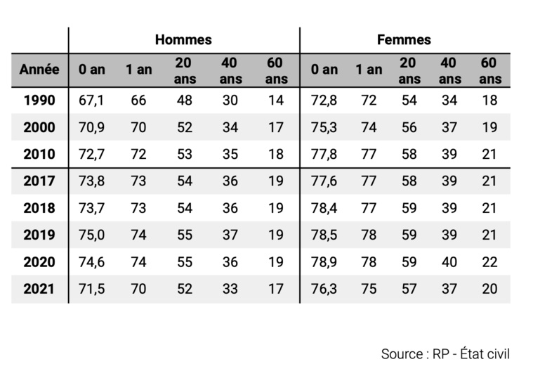 La pandémie a également eu un impact sur la moyenne de l'espérance de vie en Polynésie française. Elle s'établit en 2021 à 76,3 ans chez les femmes et 71,5 ans chez les hommes, toujours bien en-dessous de l'espérance de vie en métropole à 85,4 ans chez les femmes et 78,5 ans chez les hommes. En 2020, la pandémie n'avait entrainé aucune baisse notable de l'espérance de vie. Mais en 2021, avec la vague de mortalité entraînée par la vague du variant Delta du coronavirus en juillet dernier, les femmes ont perdu 3,1 ans d'espérance de vie et les hommes 2,5 ans.