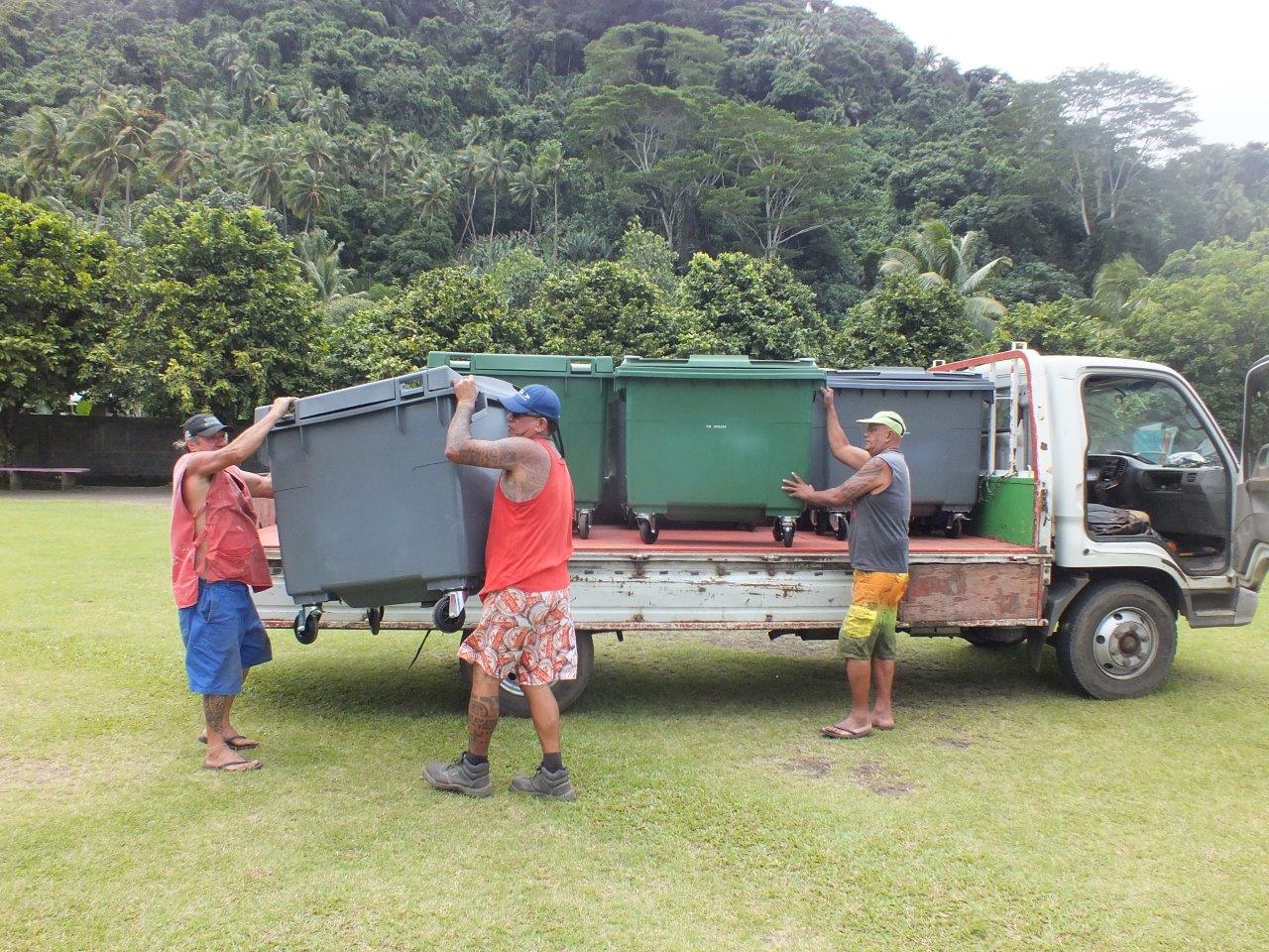 Le conseil municipal de Teva i Uta a donc souhaité y remédier en achetant, dans un premier temps, 40 bacs de 660L : 20 gris et 20 verts. Ce premier investissement, d’un montant d’1 852 288 Fcfp, vise donc les gros consommateurs. Aussitôt livrés, aussitôt distribués ! Mardi dernier, les agents du service techniques ont commencé leur tournée de distribution, dans les quatre écoles de Teva i Uta.
