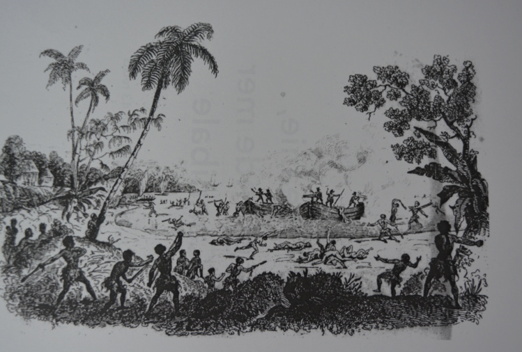 Océanie, la grande mer cannibale (400 ans d'anthropophagie en 43 récits) de Daniel Pardon est un livre publié aux éditions L'Ancre de Marine. L'ouvrage fait 360 pages. (Notre photo : Massacre du capitaine De Langle et de ses compagnons - Gravure issue de l'ouvrage paru en 1834 illustrant le voyage de Dumont d'Urville autour du monde)