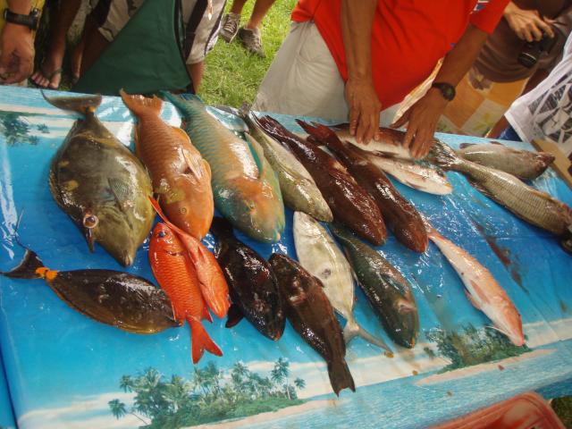 A la pesée, la population de Tautira apprécient la qualité des pêches (des gros ‘āpa’i, 'ī'ihi…) au fur et à mesure du passage à la table de contrôle des équipes. La pesée durera d’ailleurs près de 2 heures !