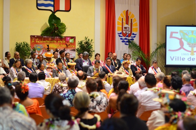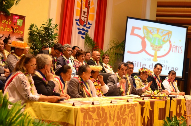 PAPEETE, le 9 mai 2015. Un conseil municipal spécial a eu lieu ce samedi matin pour célébrer les 50 ans de la commune de Pirae. Les festivités de ce samedi après-midi sont reportées pour cause de mauvais temps.