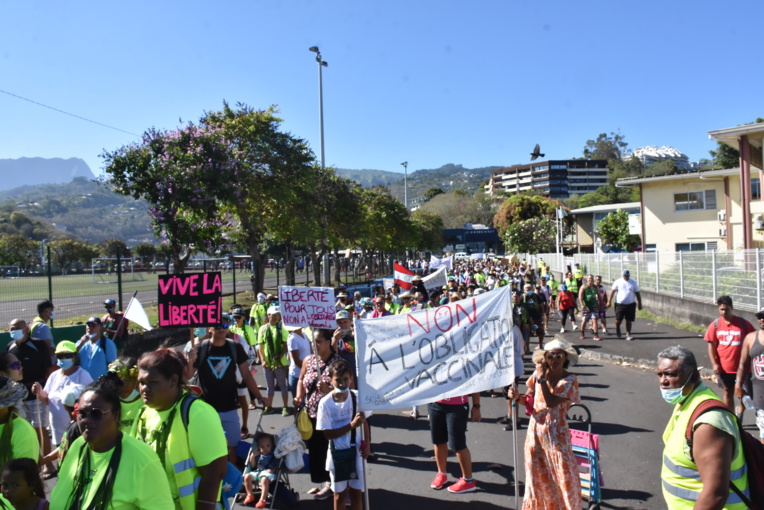 Tahiti, le 16 octobre 2021 – Une nouvelle marche contre l'obligation vaccinale était organisée, ce samedi, à Papeete, sous l'impulsion du collectif Te Reo Mana O Te Nunaa, de l'Eglise protestante mā'ohi et du syndicat O Oe To Oe Rima. Un peu plus de 700 personnes ont participé à cette nouvelle manifestation, marquée notamment par des rencontres avec des représentants de l'Etat et du Pays.