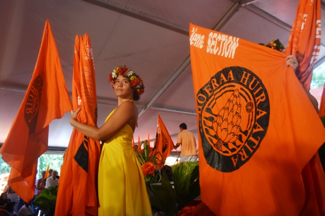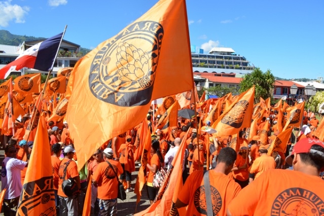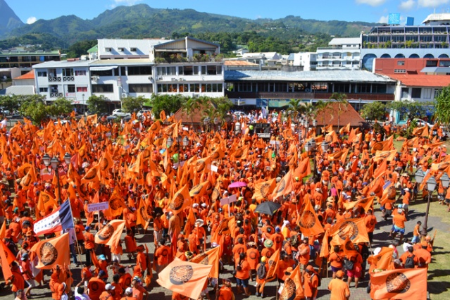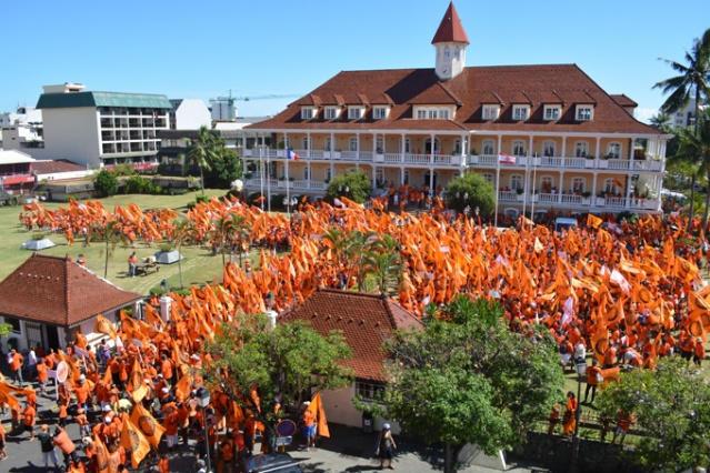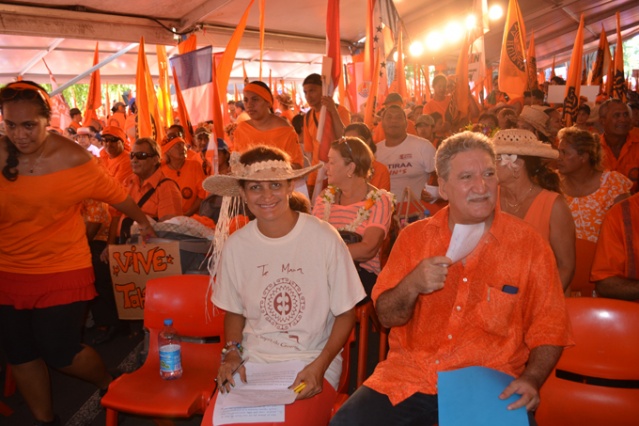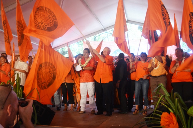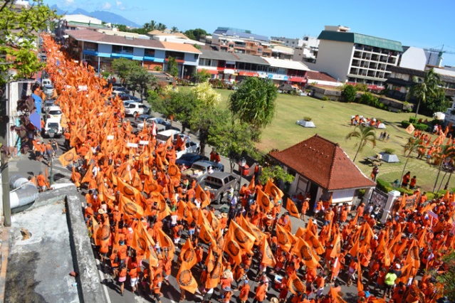 PAPEETE, samedi 23 mars 2013. La marche orange organisée par le parti Tahoeraa Huiraatira ce samedi a fait une démonstration de force à moins d’un mois du premier tour des élections territoriales des 21 avril et 5 mai prochain. Partis de la mairie de Papeete, les militants et les élus, en une longue file de drapeaux orange, ont rejoint vers 10 heures les chapiteaux installés depuis la veille sur la place Tarahoi pour ce grand rassemblement. 8000 militants orange selon le comptage officiel et 11 126 très précisément selon le comptage effectué par le parti orange étaient réunis ce samedi matin au centre ville de Papeete.