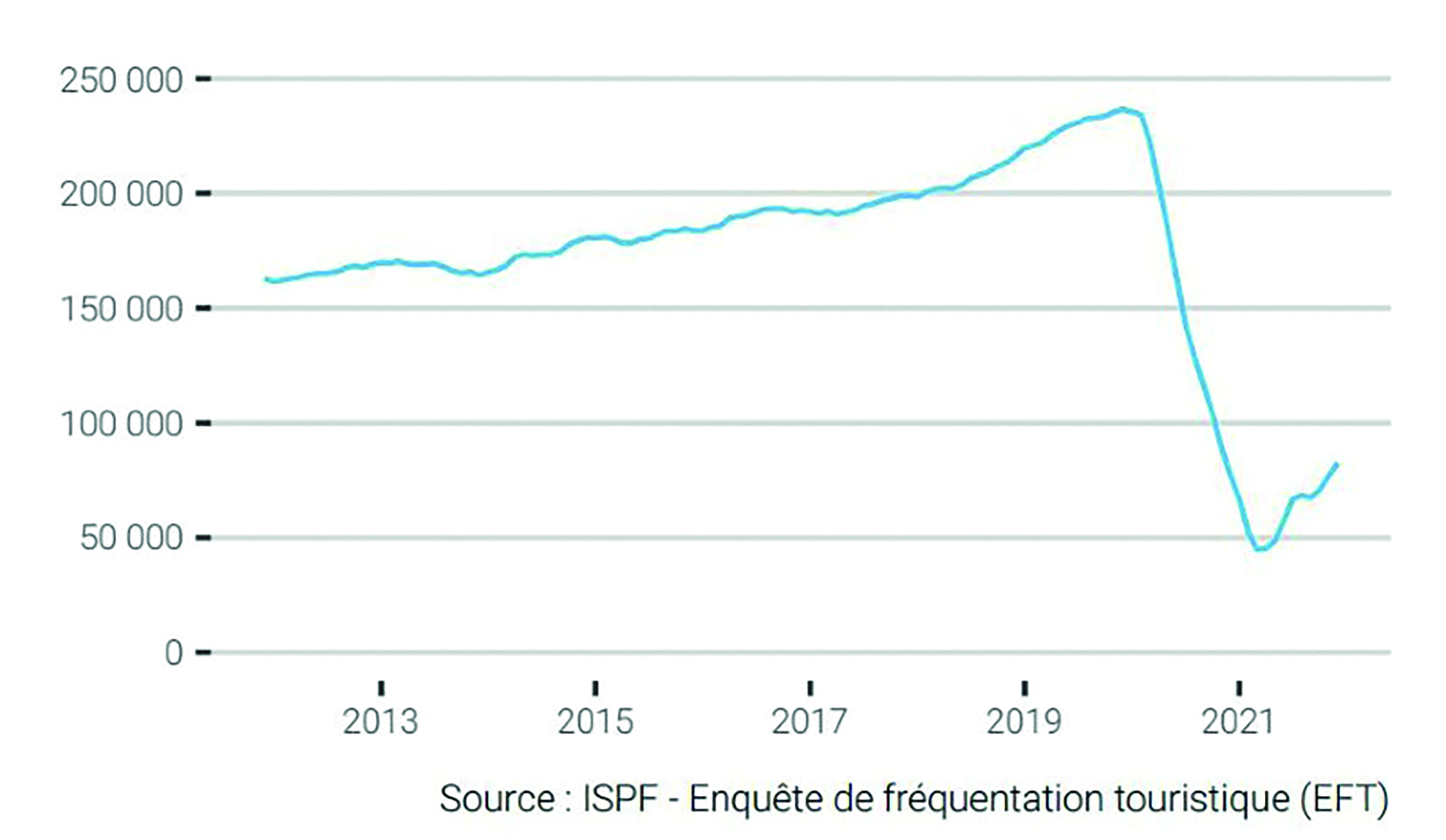 Tahiti, le 15 février 2022 - ISPF - En 2021, la fréquentation touristique en Polynésie française a entamé une légère reprise malgré un contexte épidémique difficile. Essentiellement portée par les touristes français et américains, elle reste cependant très inférieure à son niveau pré-pandémique.