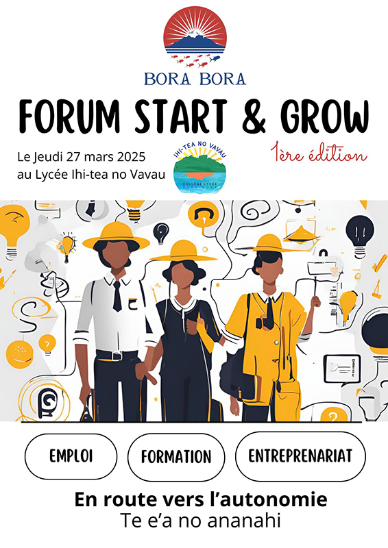 Bora Bora, le 25 mars 2025 - Afin de dynamiser la recherche d’emploi et d’offrir des perspectives aux jeunes de l’île, la commune de Bora Bora organise pour la première fois, le jeudi 27 mars, le premier forum des métiers, de la formation et de l'entrepreneuriat, baptisé “Start and Grow”, en partenariat avec le lycée polyvalent Ihi Tea no Vavau où se déroulera l’événement à partir de 9 heures.