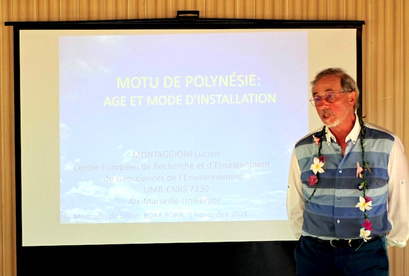 Mercredi, le Criobe, en partenariat avec la Polynésienne des eaux et l’association Ia vai ma noa Bora Bora, a organisé une conférence à Bora Bora sur le thème Âge et mode d’installation des îlots récifaux (motu) en Polynésie française. Elle était animée par le professeur Lucien Montaggioni, ancien chercheur au Criobe. Le géologue a apporté quelques éclairages sur les origines, la formation et la datation des motu, îlots de sable coralliens situés sur la couronne récifale d'un atoll ou à l'arrière d'un récif barrière d'île volcanique. À l’exception des Marquises, dépourvues de récifs coralliens, les îles polynésiennes, hautes ou basses (atolls) possèdent des motu.