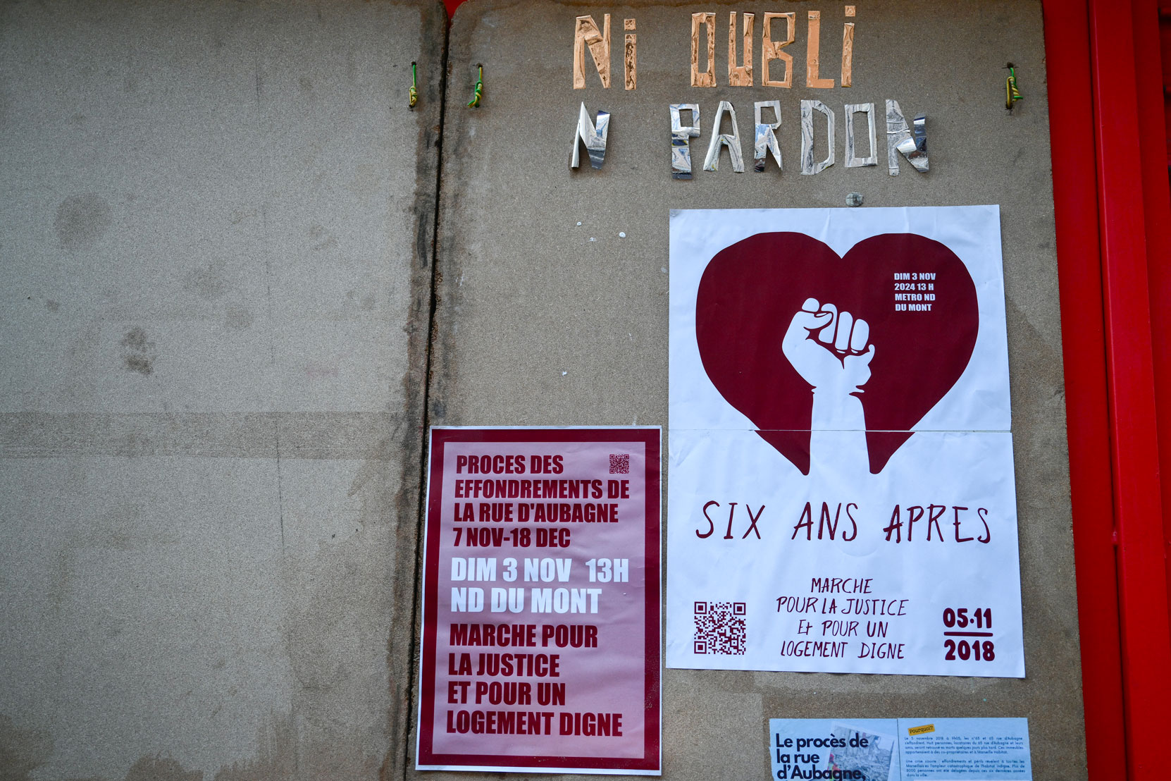 Le Collectif du 5 novembre, très mobilisé à l'approche du procès, a proposé aux Marseillais présents d'écrire un message à destination des familles ou des pouvoirs publics. Ces petits mots ont commencé à être affichés place du 5 novembre, au milieu de cette rue d'Aubagne où de nombreux immeubles ont été définitivement évacués, cassant l'ambiance d'une artère autrefois très vivante.