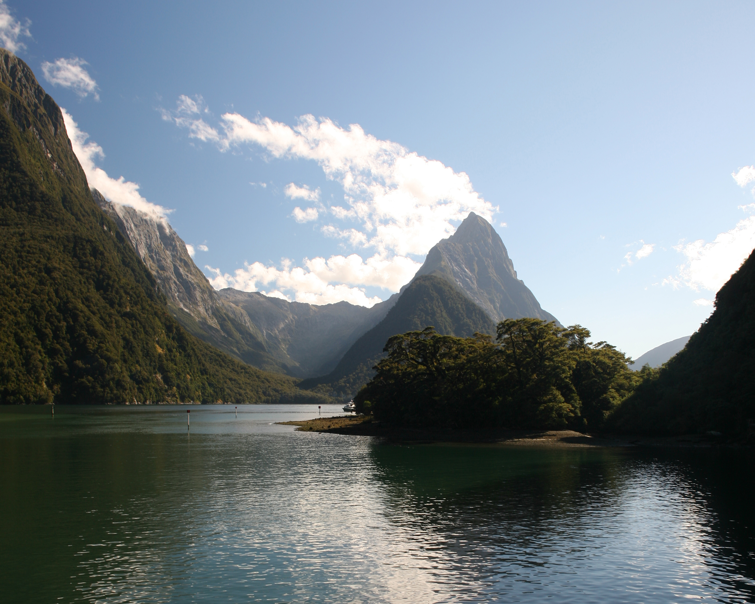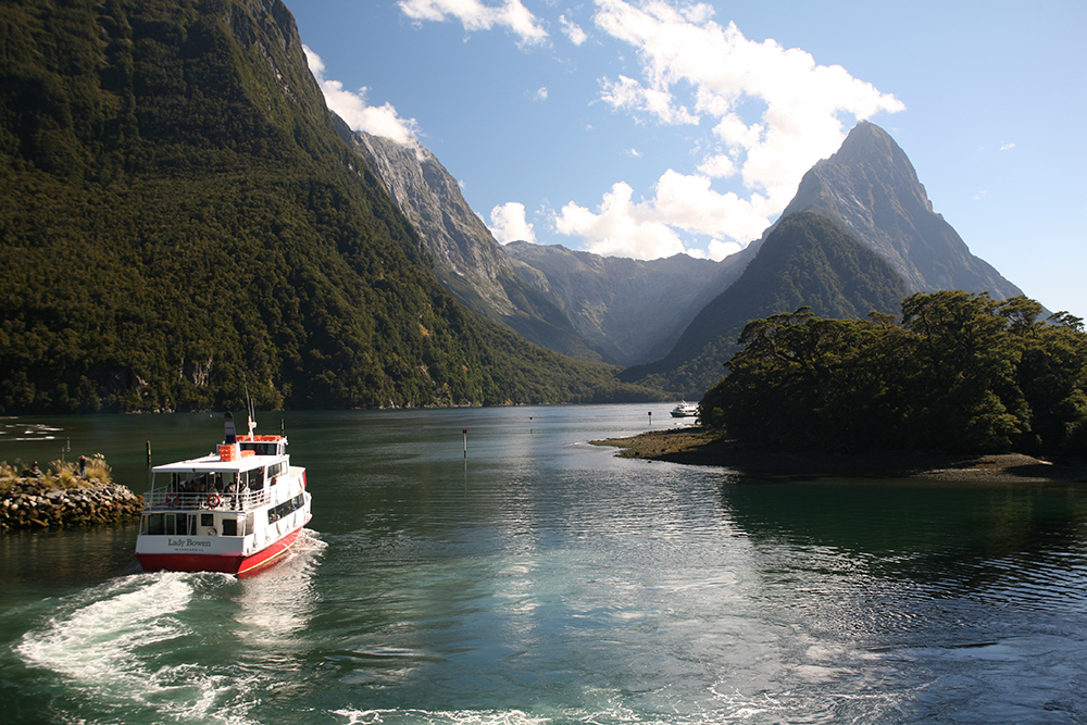 Toute la majesté de Milford Sound, depuis le fond du fjord : la dent du Mitre Peak culmine à 1 692 m au-dessus de la mer…