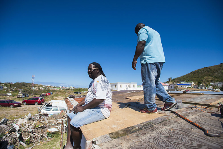 Sur le toit d'une autre maison, deux hommes clouent des planches pour remplacer les bâches bleues qui recouvraient la structure. L'un d'eux, Gilbert, 50 ans, en est propriétaire.