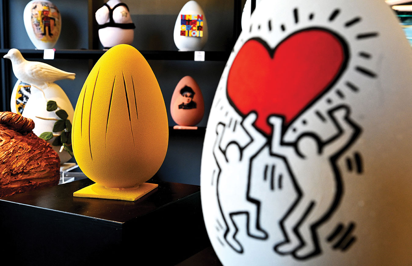 Chaque œuf en chocolat est sculpté en hommage à un artiste choisi par le maître des lieux, Walter Musco, un Romain de 47 ans sanglé dans sa veste immaculée qui déambule avec nonchalance au milieu de ses créations: deux personnages de Keith Haring s'agitent sous un cœur, un œuf jaune tournesol est orné d'incisions comme les toiles du peintre argentin Lucio Fontana, une colombe s'est échappée d'une photo de l'Américain Robert Mapplethorpe.