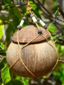 Delphine tenant en main un hameçon sculpté par Maurice : « mon mari, je l’ai pêché à Hane avec ce genre d’hameçon et avec de la force, je l’ai ramené chez moi, à Hokatu » explique-t-elle avec un large sourire.