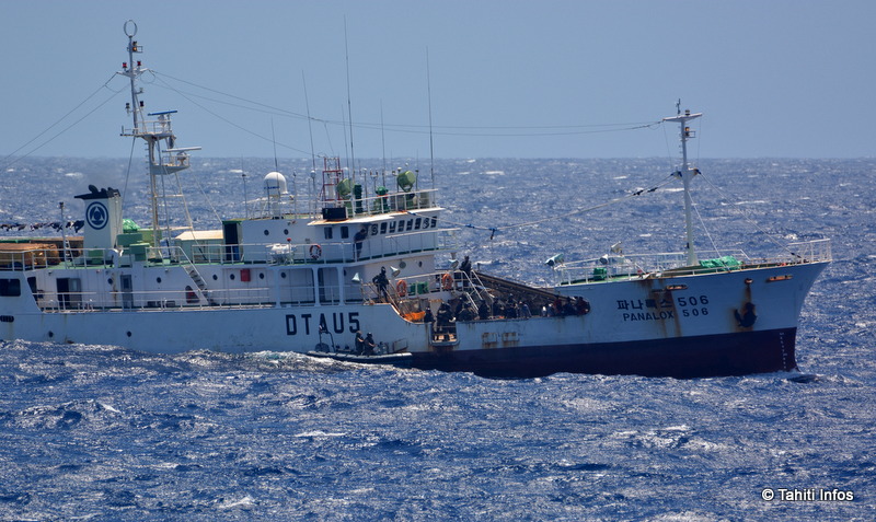 C'était également l'occasion d'observer les mouvements de ces bateaux de pêche industrielle, qui restent plusieurs années en mer. Une fois leurs palangres lâchées sur plusieurs kilomètres, ils reviennent sur leurs pas et récupèrent leurs lignes en un aller-retour impossible à confondre avec le comportement d'un bateau en transit (par exemple quand ces navires viennent à quai à Papeete pour un carénage et une escale bien méritée après des mois sans voir la terre). Ces bateaux ont l'obligation d'émettre leurs positions en continu avec des balises AIS et VMS, ce qui permet de surveiller en direct ces va-et-vient. Couper ces balises, en particulier avant d'entrer dans notre ZEE (s'il leur venait à l'idée de se livrer à une pêche illégale dans nos eaux), serait une très mauvaise idée pour le capitaine : leur position est suivie en permanence par le CCOM de Papeete, et leur disparition des cartes provoquerait l'envoi immédiat d'un avion en reconnaissance, au cas où le navire serait en difficulté. S'il est alors vu en train de pêcher, il s'expose à des amendes particulièrement salées et même à la saisie du bateau. Un dispositif de surveillance très solide, qui expliquerait qu'aucun cas de pêche illégale n'a été constaté dans notre ZEE depuis... 2007.