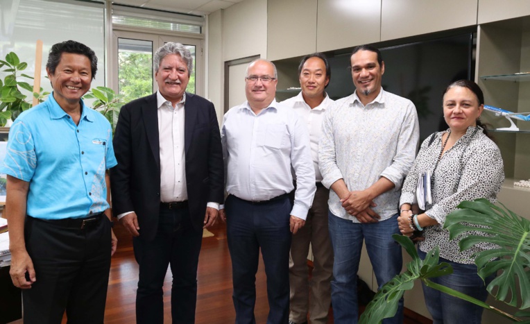 Christophe Masson, président du Grand Port maritime (GPM) de Bordeaux, Michel Le Van Kiem, administrateur du GIE Vigie-port, Daniel Houmbouy, directeur général du Port autonome de Nouvelle-Calédonie, Georges Puchon, directeur général du Port autonome de Papeete, et en présence de Catherine Rocheteau, directrice des affaires maritimes polynésiennes (DPAM), ont rendu visite, vendredi dernier, au ministre, Jean-Christophe Bouissou, chargé des transports interinsulaires.