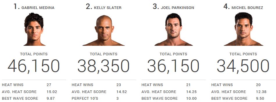 Le N°1 Mondial actuel Gabriel Medina retrouvera pour sa part l'australien Adam Melling et le costaricain Carlos Munoz, vainqueur d'une wild-card, tandis que que Kelly Slater, N°2 mondial depuis sa très belle performance (2e) à Teahupoo, rencontrera l'australien Matt Wilkinson et l'américain Tanner Gudauskas.