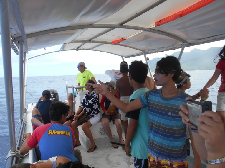 MOOREA, le 29 octobre 2018. Des élèves du collège de Afareaitu feront des échanges culturels, sportifs et scientifiques avec des élèves hawaïens de Kamehameha schools en 2020.Dans le cadre de leur préparation, les adolescents de l’ile sœur sont partis à la rencontre de baleines à bosse à Haapiti vendredi dernier. L’idée était de faire connaitre aux écoliers ces mammifères marins et de les sensibiliser à leur protection.