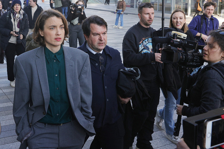 Costume gris sur une chemise verte, celle qui s'est depuis mise en retrait du cinéma était arrivée en avance, attendant l'ouverture de l'audience visage tendu, faisant les cent pas.
