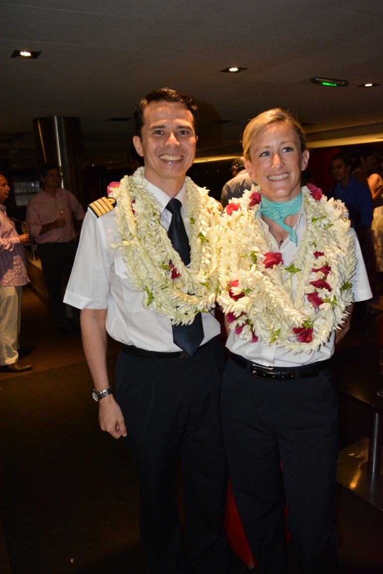 PAPEETE, le 19 aout 2014 - Lors d’une cérémonie de remise de galons organisée ce lundi 18 août à 17h30 à l’hôtel Tahiti Nui de Papeete, Mme Agnès Chantre et M. Stéphane Hellouin ont reçu leurs galons d’Air Tahiti Nui, ce qui signifie qu’ils ont été promus commandants de bord. Ils ont été accueillis à leur nouveau poste par la direction générale et l’équipe d’encadrement et de formation des personnels navigants techniques de la compagnie au tiare.