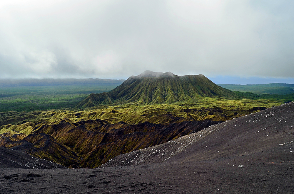 Ambrym est noire comme la peau de sa population mélanésienne, certes, mais elle est surtout noire par l’épaisseur de ses forêts comme par le lourd couvercle de nuages qui en recouvre le sommet bifide.