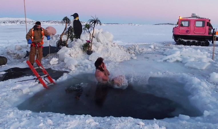 Pour célébrer cette date, les occupants de la base ont percé à la tronçonneuse un trou étroit dans la glace, ouvrant ainsi sur une eau à moins 1,8 degré, alors que la température de l'air est à moins 30.