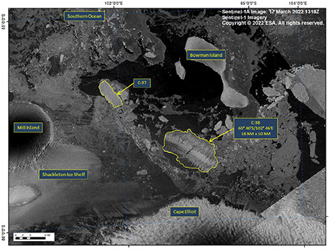 Selon le National Ice Center, agence américaine qui surveille la glace flottante, la désintégration de la barrière a donné naissance à un iceberg de près de 30 km de long sur 18 km de large, baptisé C38, qui s'est ensuite brisé en deux morceaux.