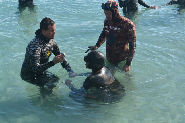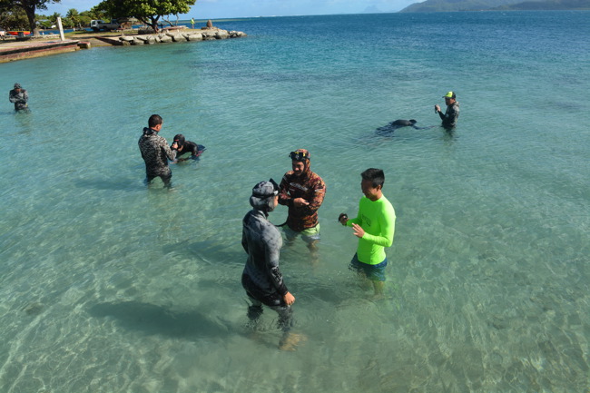 Il est 9 heures quand madame le maire accueille les compétiteurs sur la zone. La prière effectuée et le protocole rappelé, les compétiteurs rentrent dans la zone pour s’échauffer. A l’appel de leur nom, ils disposent de 3 minutes maximum pour s’immerger. Rowan Taurei, jeune pêcheur de l’as Tefana, lance les hostilités en annonçant à peine 1minute et en réalisant finalement 3’17. La barre est placée.