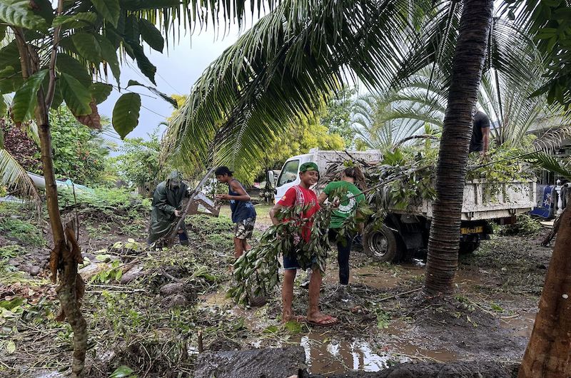 Les habitants de Teahupo'o s'entraident pour nettoyer les dégâts de la crue. Crédit photo : FB Moetai Brotherson.