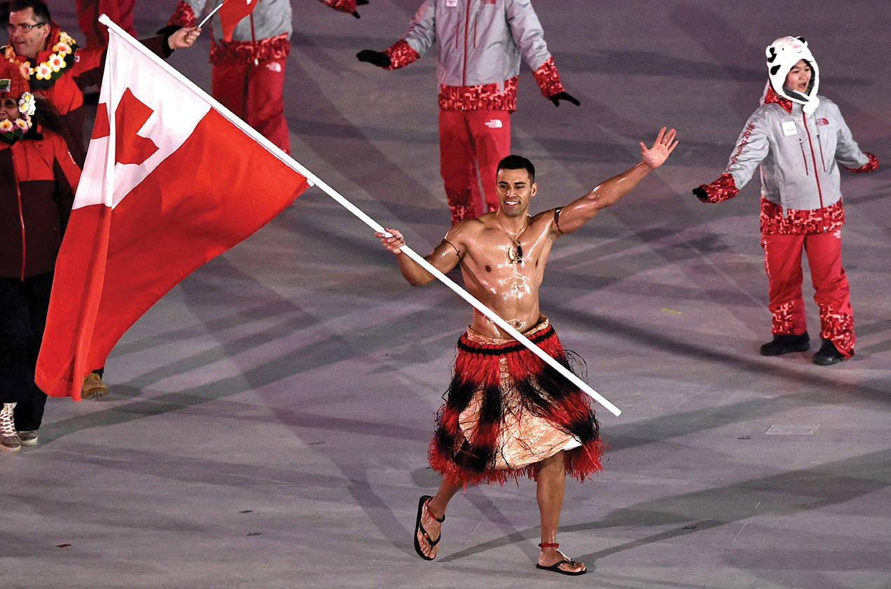 Basé à Brisbane, Taufatofua attache des planches de bois à ses pieds pour simuler le ski sous la chaleur étouffante australienne. Il doit se rendre en Islande pour obtenir sa qualification. Il finira digne 114e en Corée du sud.