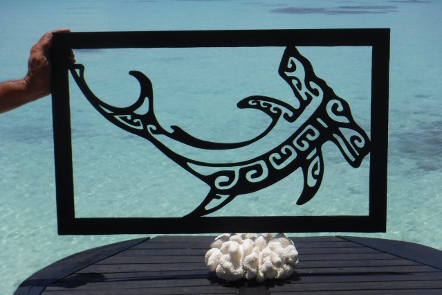 Il y a, enfin, des pièces qui sont comme des tableaux ajourés. "Enoha dessine sur un cahier un requin par exemple. Il le passe ensuite à la taille désirée puis découpe ce motif avec une scie sauteuse modifiée dans du contreplaqué marine."