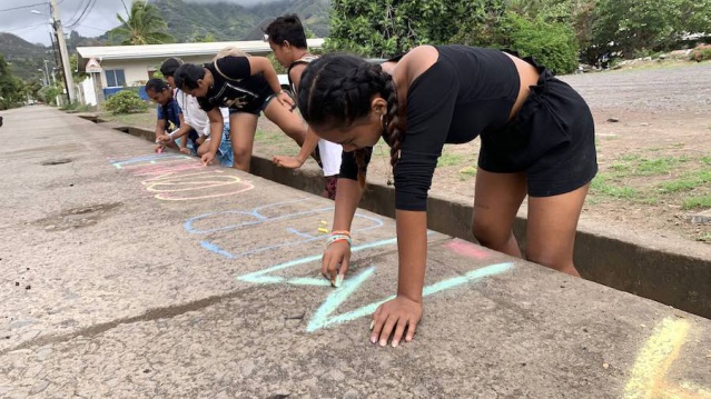 Au programme de cette édition anniversaire, une première action “coups de craie” dans les rues du village, très animées grâce à la présence de l'Aranui, en escale à Ua Pou. Les élèves de 3e se sont prêtés à un exercice de Street Art éphémère au bord des caniveaux, en inscrivant “La mer commence ici”. Ces inscriptions à certains points stratégiques –devant l’église, le CSP, des commerces fréquentés et la brigade de gendarmerie de Hakahau– représentent un appel à l’écocitoyenneté : “L’océan ne monte pas jusqu’en haut, mais qu’est-ce qui descend vers la mer ? Les déchets… qui vont arriver dans notre AME” rappelle Marie aux étudiants, “notre arme aujourd’hui, c’est la craie.”