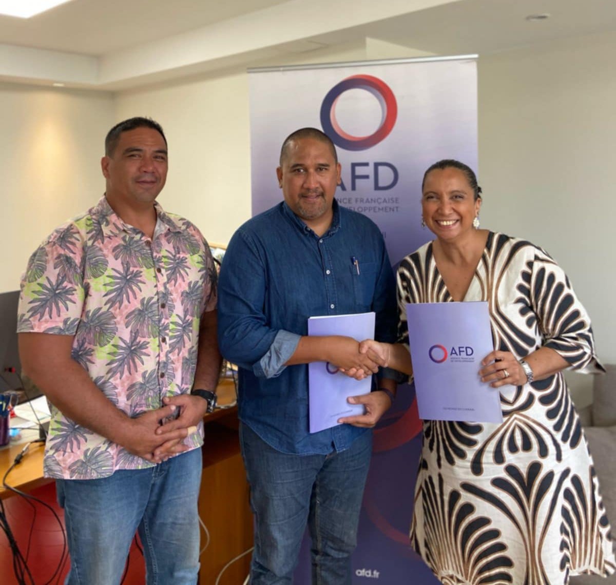 Le maire de Makemo, Félix Tokoragi, reçu par la directrice de l’AFD en Polynésie, Mounia Ait Ofkir, lors de la signature du prêt accordé pour la rénovation de la mairie (Crédit : AFD).
