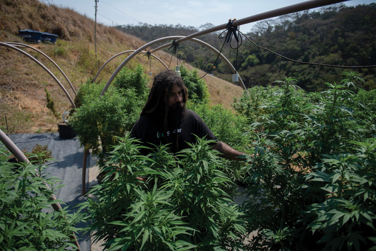 Sur le terrain protégé par des barbelés et des clôtures électriques, un ingénieur agronome se fraie un chemin entre les pieds poussant dans de grands pots noirs, le long des écriteaux sur lesquels on peut lire le nom de chaque variété: Purple Wreck, Schanti, Doctor, Harle Tsu, Solar, CBG.