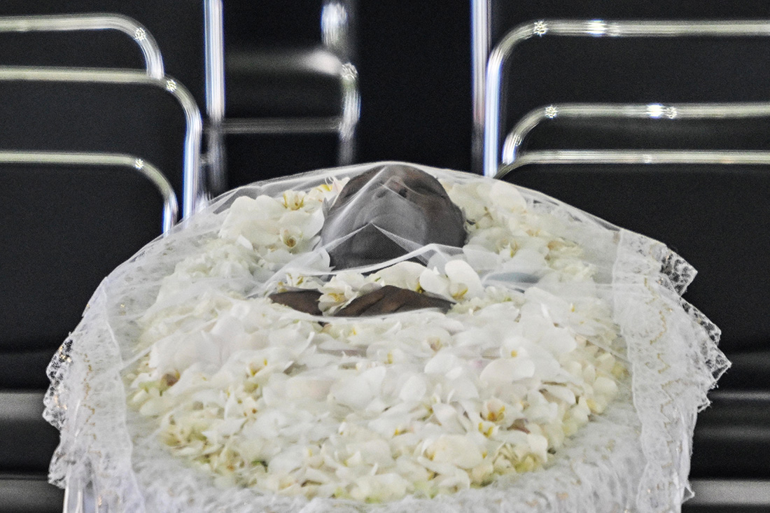 Des dizaines de couronnes de fleurs, envoyées par des personnalités du football comme la star du Paris SG Neymar ou des clubs étrangers comme le Real Madrid, ont été disposées autour du cercueil.