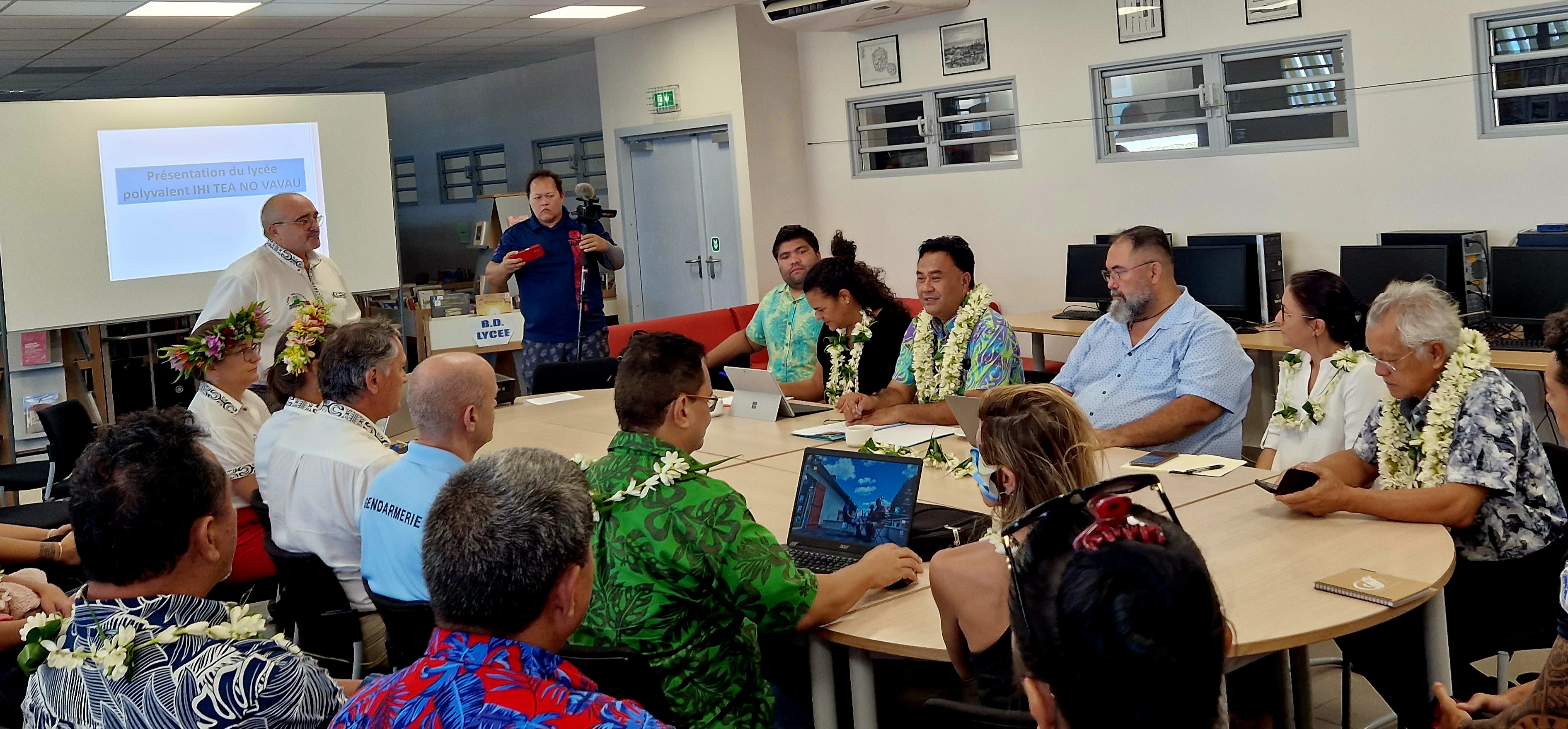 Accueillie par l’équipe de direction du lycée Ihi Tea no Vavau, le maire Gaston Tong Sang et des membres de l’équipe municipale, la délégation ministérielle s’est rendue dans cet établissement du secondaire afin d’y rencontrer tous les partenaires impliqués dans la lutte contre l’insécurité et la violence à l’école. Personnels de la vie scolaire, membre de l’association des parents d’élèves, représentants des directeurs d’école et des forces de l’ordre ainsi que des confessions religieuses étaient tous réunis autour de la table pour tenter de poser un diagnostic et d’envisager des solutions pérennes. Pour le ministre de l’Éducation, il s’agit de “recueillir ce qu’il y a de meilleur chez chaque partenaire afin de favoriser la réussite des élèves. Tous nos élèves peuvent réussir si nous menons une action qui nous ressemble et nous rassemble”.