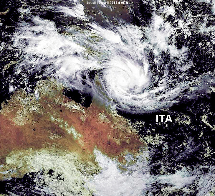 Né au sud des îles Salomon il y a quelques jours, la tempête tropicale Ita s'est renforcée pour devenir un cyclone de catégorie 3, puis 4 il y a quelques heures, et maintenant 5. Ce cyclone est actuellement situé à environ 400 km des côtes australiennes, et les vents y soufflent déjà très violement, avec des rafales proches des 260 km/h. Il s'agit donc déjà d'un cyclone majeur, qui gagne encore en puissance avant d''arriver sur les côtes australienne d'ici 24 à 36 heures.