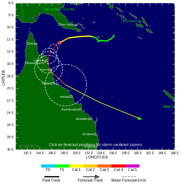 Actuellement, le cyclone continue de se renforcer dans les eaux surchauffées de la mer de Corail à près 29 degrés. Il vient donc de passer en catégorie 5 avec des vents proches du centre de 260 km/h. Il va aborder la côte du nord-est du Queensland en Australie, entre Cape Melville et Cooktown, région qui sera la plus touchée.