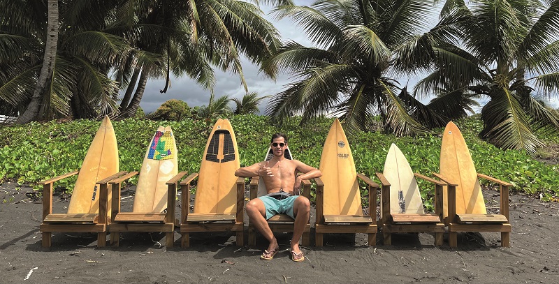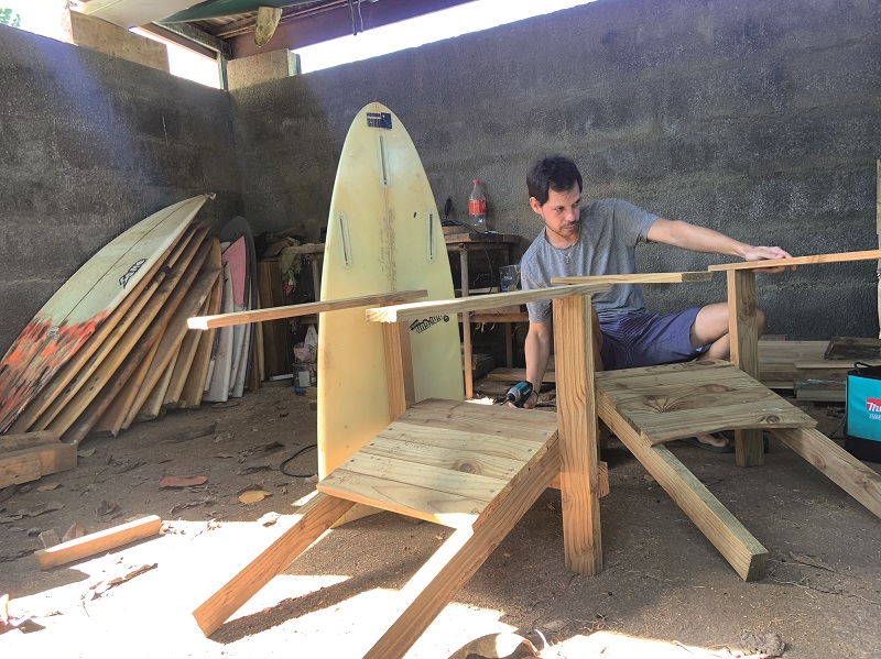 Dans son modeste atelier improvisé, niché au coin de son garage, le sol tapissé de sciure de bois, des carcasses de planches de surf alignées maladroitement le long d'un mur, Clément Nouveau, tel qu'il le fait chaque jour de repos, façonne l'ossature de ce qui deviendra l'une de ses chaises. Ce chef pâtissier de profession, originaire des Landes et installé au Fenua depuis plus de quatre ans, a lancé Recycle Ton Surf, en parallèle de son travail, depuis 2022. Une initiative qui s'inscrit dans une démarche écologique. “C'est une démarche d'upcycling, pour éviter de jeter et pour montrer qu'on peut réutiliser les choses. D'autant que les matières avec lesquelles sont fabriquées les planches, la mousse ou la résine, sont désastreuses pour l'environnement”, souligne Clément pour Tahiti Infos, en s'installant dans le jardin de sa maison de Mahina. Ces chaises, made in Tahiti donc, rencontrent déjà un certain succès, malgré une production limitée. Elles ont notamment attiré l'attention du Comité olympique de Polynésie, qui a commandé quatre de ces fauteuils pour les installer dans un espace VIP lors de l'événement. Un formidable coup de projecteur à venir sur son activité, débutée par hasard, il y a plus de deux ans maintenant.