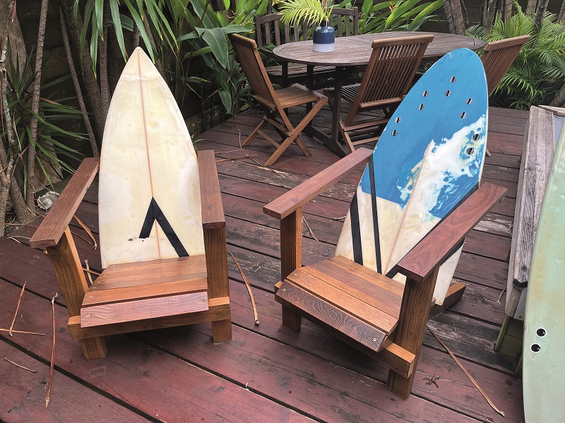 En effet, le Landais utilise des boards abîmées, mais pas irrécupérables, ce qui freine sa production. “Heureusement, l'an passé, j'ai rencontré un surfeur de la Presqu'île qui m'a troqué une quinzaine de ses planches abîmées contre une chaise. Sinon, je fais de la récupération ou alors je suis obligé de les racheter”, nous explique Clément, ce qui a pour conséquence d'augmenter inexorablement le prix de ces sièges. “Si tu me fournis la planche de surf, ils sont facturés 15 000 francs l'unité, pareil si je récupère la planche gratuitement quelque part. Ça rembourse le bois traité que j'achète et un peu la main-d'œuvre, parce que ça demande du temps. Le bois utilisé est du pin maritime de bonne qualité, que je lasures bien sûr pour qu'il résiste aux intempéries. En revanche, si je dois acheter la planche, je rajoute le prix qu'elle m'a coûté à la facture finale.”