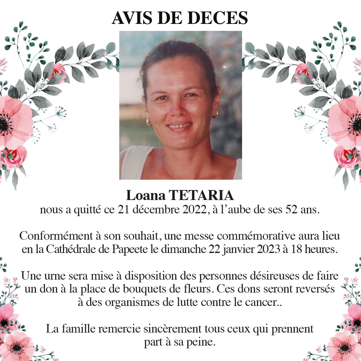 Avis de décès de la famille TETARIA pour la défunte Loana TETARIA