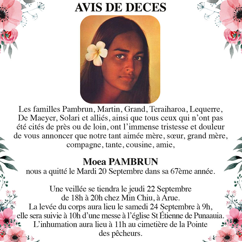 Avis de décès des familles PAMBRUN, MARTIN, GRAND, TERAIHAROA, LEQUERRE, DE MAEYER, SOLARI et alliés pour la défunte Moea PAMBRUN