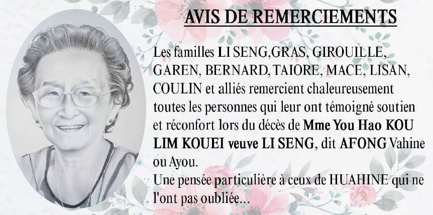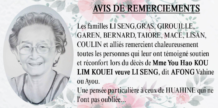 Avis de remerciements Famille LI SENG - KOU LIM KOUEI